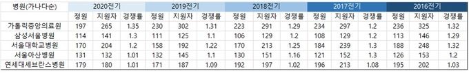 삼성서울병원은 1:1.3, 서울대학교병원은 1:1.2, 서울아산병원은 1:1.01, 세브란스병원이 1:1.01을 기록했다. 이들 또한 2016년도 전기모집부터 지금까지 늘 경쟁의 연속이었다.