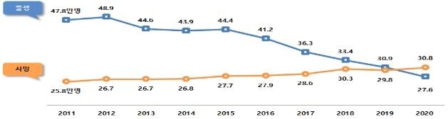 반면 사망자 수는 30만7764명을 기록하면서 한국 사회는 첫 '인구 데드크로스'를 기록했다. 사망자 수가 출생아 수보다 많아지면서 인구가 자연 감소하는 현상이다.