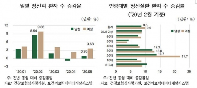 김 연구위원은 "청년·여성·고령층 정신과 진료인원 증가는 각각 학업과 취업 등으로 인한 스트레스, 낮은 사회·경제적 수준, 고령화에 따른 노인성 질환인 치매 증가 등에 기인하고 있다"고 분석했다.