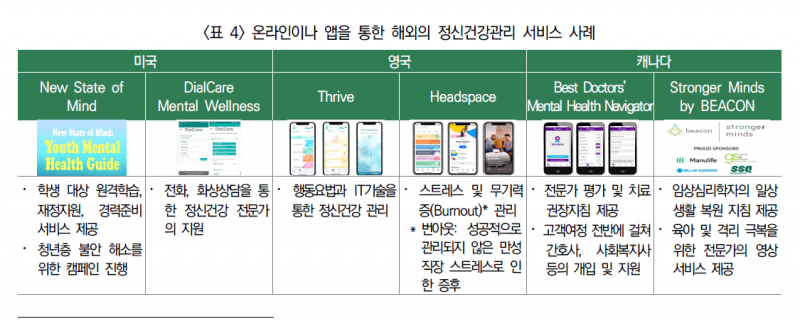 김동겸 연구위원은 "해외에서는 정신건강 관리를 위해 지역사회 예방기능 강화, 정보기술(IT)을 활용한 상담서비스, 경제적 지원 등의 공적 기능을 강화와 더불어 민간영역(보험회사)에서는 건강관리서비스 제공을 통해 정신질환을 사전 예방하고 있다"며 "다만 정신건강관리 솔루션을 제공하는 앱은 안전성과 효과성을 입증할 필요가 있다"고 설명했다.