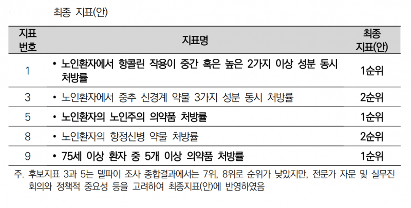 특히 단기지표는 ▲노인환자 주의 의약품 처방률 ▲노인환자 항정신병 약물 처방률 ▲75세 이상 환자 중 5개 이상 의약품 처방률 등이 선정됐다.