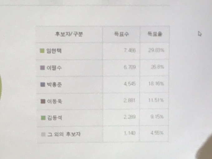 각 후보 득표사항은 임현택 후보(7466표·29.83%), 이필수 후보(6709표·26.9%), 박홍준 후보(4545표·18.16%), 이동욱 후보(2881표·11.51%), 김동석 후보(2299표·9.15%) 등이었다.
