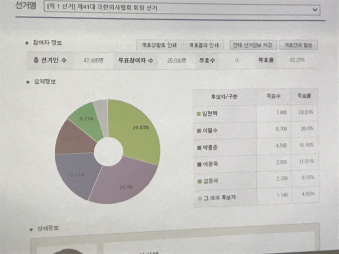 7시 10분 경 전자투표 개표 결과가 공개됐고 기호1번 임현택 후보가 전체 2만 5030표 가운데 7466표를 얻어 1위를 차지했다. 2위는 이필수 후보로 6099표를 얻었다.