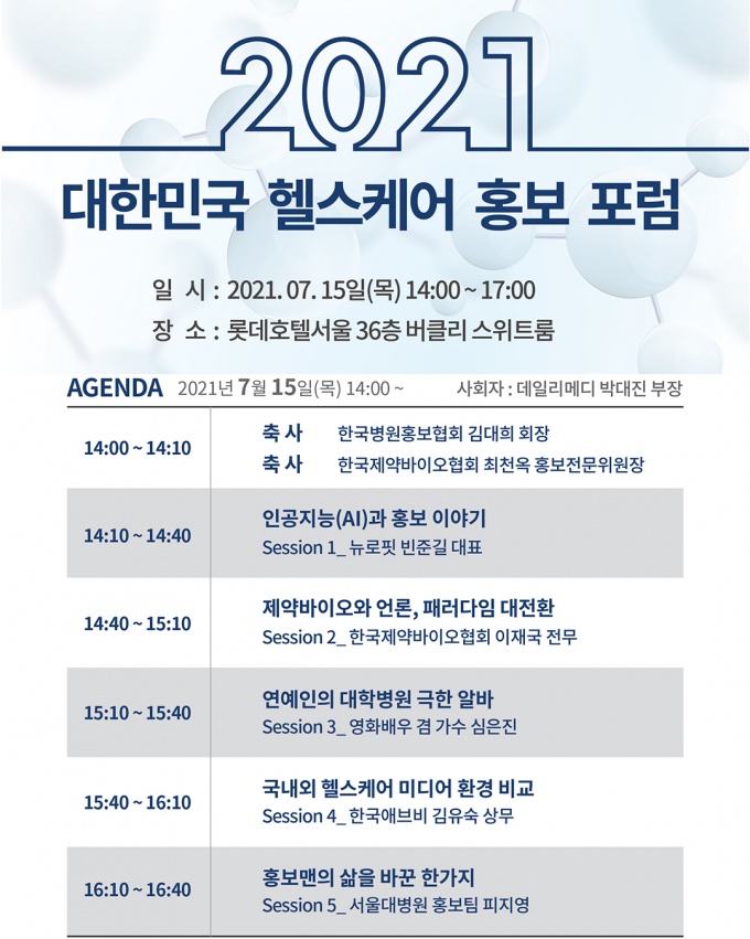 데일리메디가 주최하고 한국병원홍보협회가 후원하는 ‘2021년 대한민국 헬스케어 홍보 포럼’은 오는 7월 15일 오후 2시 서울 소공동 롯데호텔에서 개최된다.