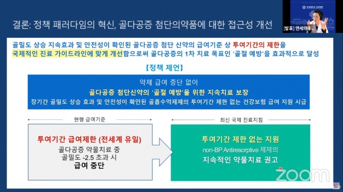 그는 “현행 급여기준 상 골다공증 약제의 투여기간을 골밀도 T값을 기준으로 제한, 지속치료가 어려운 나라는 전세계에서 한국이 유일한 상황”이라고 강조했다.