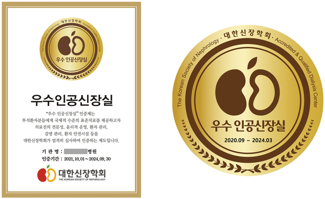 평가 기준은 의사와 간호사 인력, 시설과 장비, 수질검사, 투석 과정, 윤리성 등으로, 이번에 인증평가를 신청한 128개 기관 중 110개 기관(85.9%)이 인증을 획득했다. 인증기관은 학회로부터 우수 인공신장실 증서와 인증 마크를 받으며 인증기간은 3년이다.