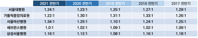 서울대병원(1.29:1), 가톨릭중앙의료원(1.26:1), 서울아산병원(1.25:1), 삼성서울병원(1.18:1), 세브란스(1.09:1) 순으로 5개년 동안 상위권과 하위권 그룹은 크게 변화가 없었다.