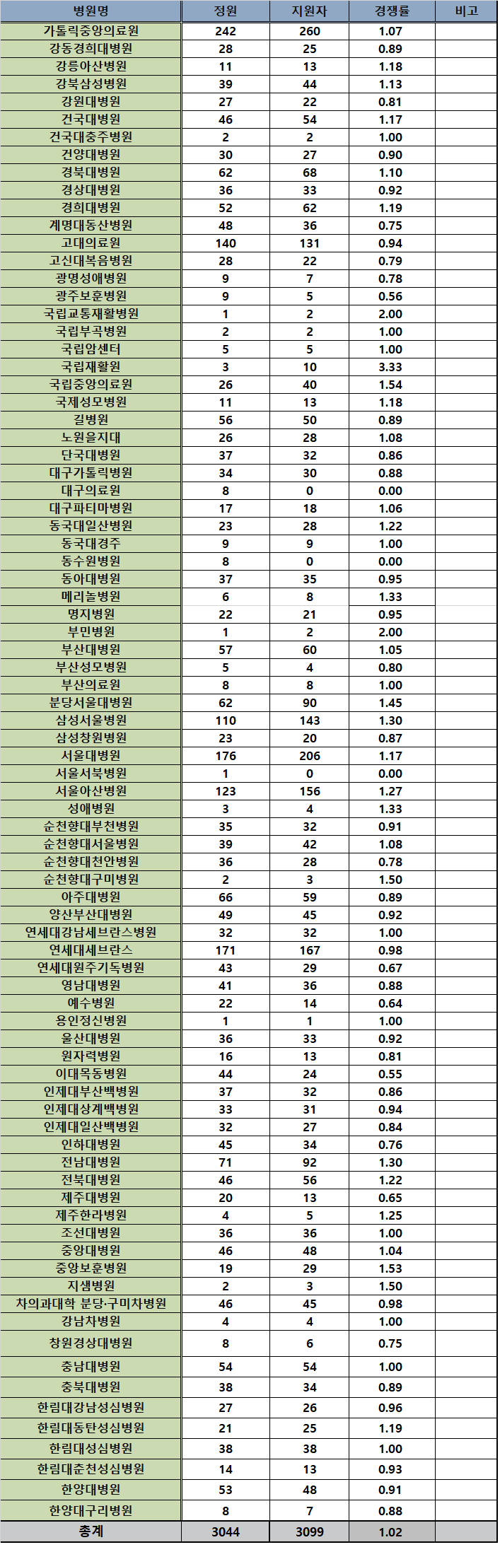 다만, 양산부산대병원과 제주대병원은 충원에 실패해 0.50 경쟁률을 나타냈으며, 경상대병원은 2명을 모집했지만 지원자는 단 한 명도 없었다.