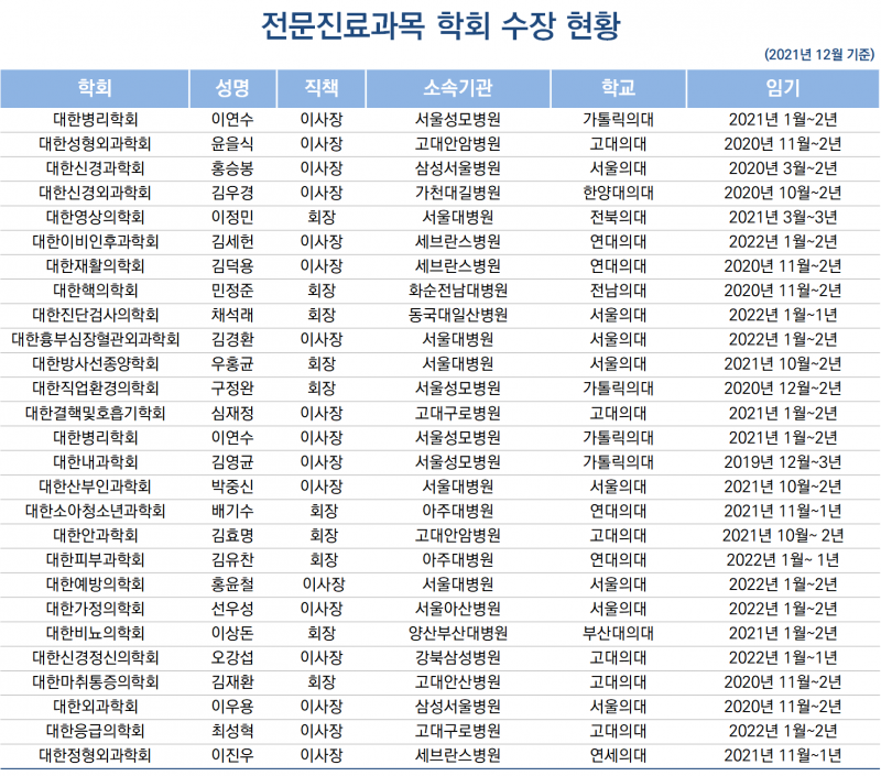 ▲서울대병원은 대한영상의학회 이정민 회장, 대한흉부심장혈관외과학회 김경환 이사장, 대한방사선종양학회 우홍균 회장, 대한산부인과학회 박중신 이사장, 대한예방의학회 홍윤철 이사장 ▲서울성모병원은 대한병리학회 이연수 이사장, 대한직업환경의학회 구정완 회장, 대한내과학회 김영균 이사장이 속해있다.