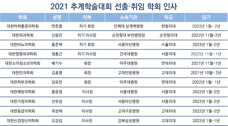 또한 대한외과학회 차기 이사장은 신응진 순천향대부천병원장, 대한정형외과학회 차기 이사장에 정홍근 교수(건국대병원)가 바통을 이어받아 2022년 11월 취임한다.