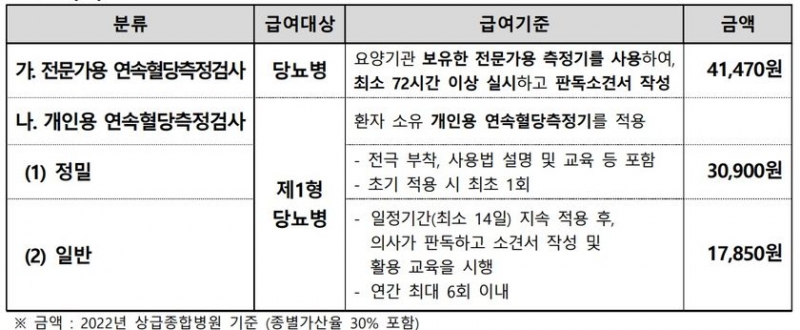 환자가 소유한 개인용 연속혈당측정기 부착, 사용법 교육 등에 대해서는 최소 1회에 한해 3만900원, 일정기간 지속 적용 후 판독하는 경우 1만7850원을 받게 된다.
