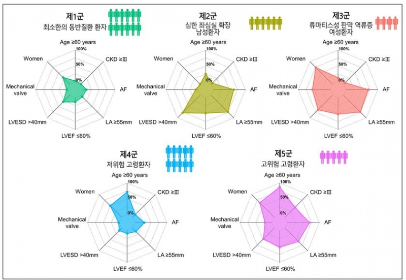 표현군은 ▲제1군(최소한의 동반질환 환자) ▲제2군(심한 좌심실 확장을 보이는 남성) ▲제3군(류마티스성 판막 역류증을 보이는 여성) ▲제4군(저위험 고령자) ▲제5군(고위험 고령자)으로 구분됐다. 제1~3군은 상대적으로 젊은 환자들이었다.