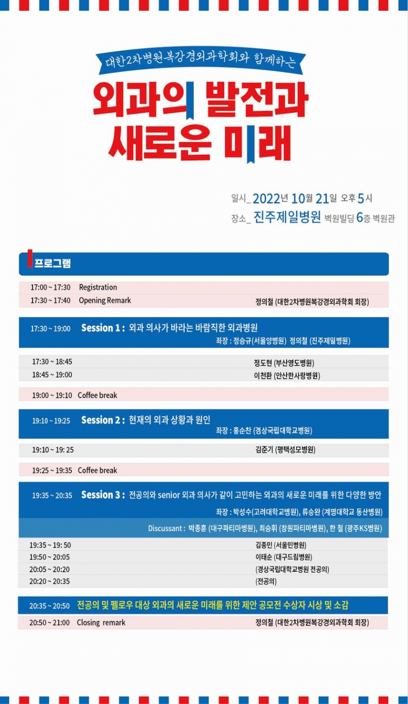 두 번째 세션은 경상대학교병원 외과 홍순찬 교수가 좌장을 맡고 평택성모병원 김준기 외과과장이 ‘현재의 외과 상황과 원인’이라는 주제로 강연한다.