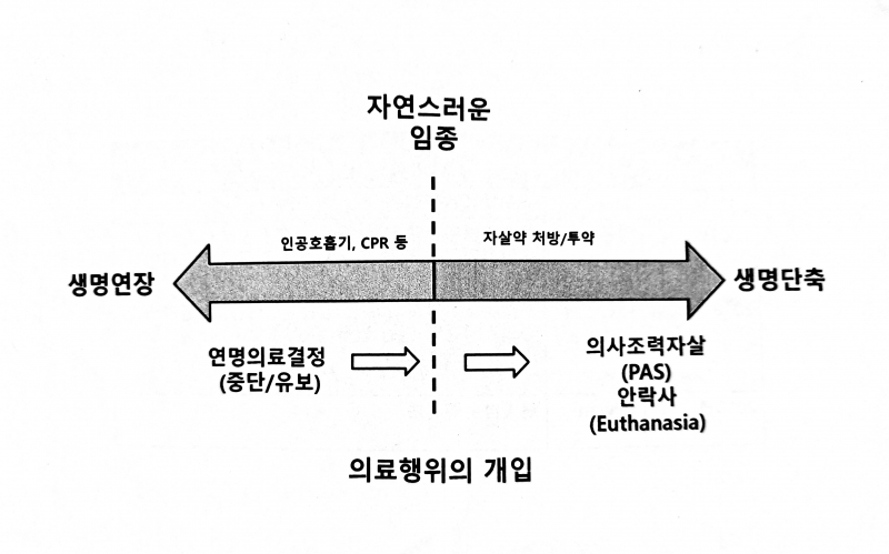 그에 따르면 환자가 죽음에 이르도록 의료인이 개입하는 상황은 ▲임종기 연명의료중단 ▲말기 연명의료중단 ▲식물·치매 상태 연명의료중단 ▲의사조력자살 ▲안락사 등의 단계로 구분할 수 있다.