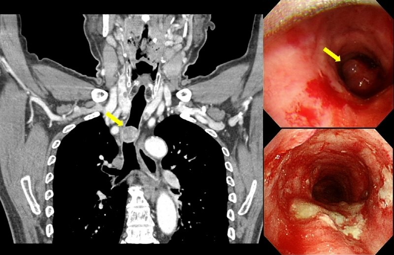 환자의 기도를 막고 있던 희귀 종양(왼쪽, 오른쪽 위 사진 화살표)과 수술 후 제거된 모습(오른쪽 아래). 사진제공 서울아산병원