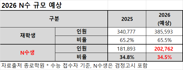 임성호 종로학원 대표는 "2026학년도 의대 모집 정원이 아직 확정되지 않아 이 변수가 N수생 유입에 상당한 영향을 미칠 것으로 보인다"고 예상했다.