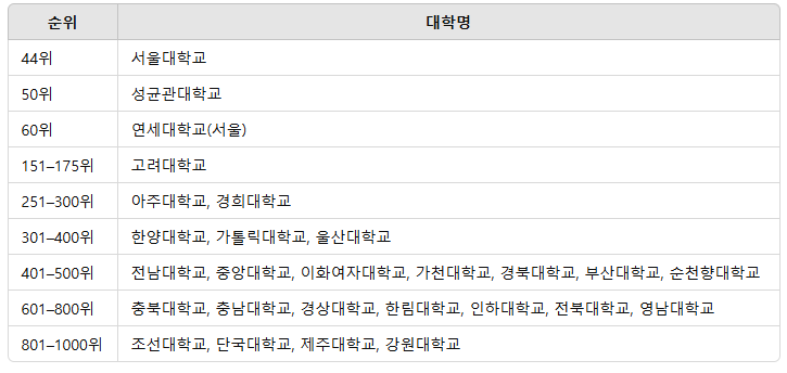 101위~400위권에는 ▲고려대학교(151 175위) ▲아주대학교(251 300위) ▲경희대학교(251 300위) ▲한양대학교(301 400위) ▲가톨릭대학교(301 400위) ▲울산대학교(301 400위)가 선정됐다.