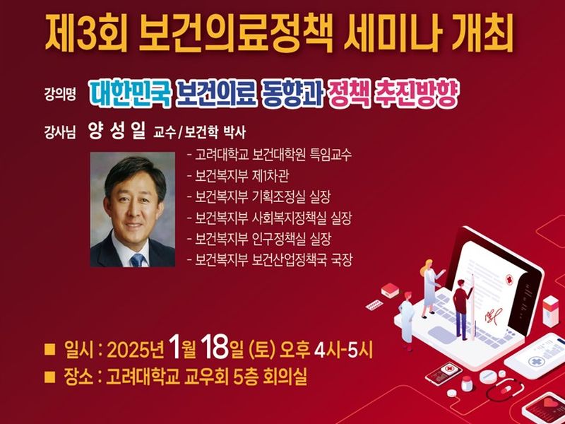 고려대학교 대학원 보건안전융합과학과(주임교수 김성욱)는 오는 18일 오후 4시 교우회관 5층 소회의실에서 ‘제3회 보건의료 정책 세미나’를 개최한다.