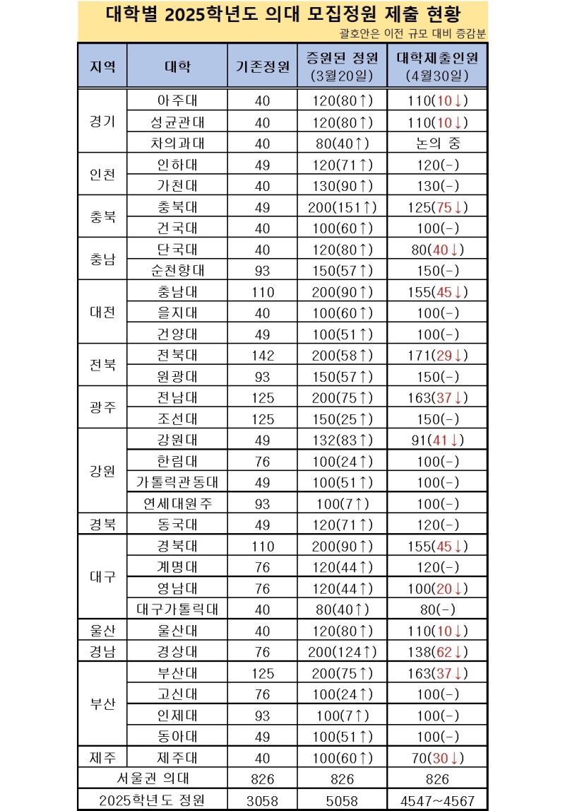 아주대, 성균관대, 울산대는 각각 증원분에서 10명씩 줄였으며, 이밖에 대학은 증원분을 100% 반영하기로 했다.