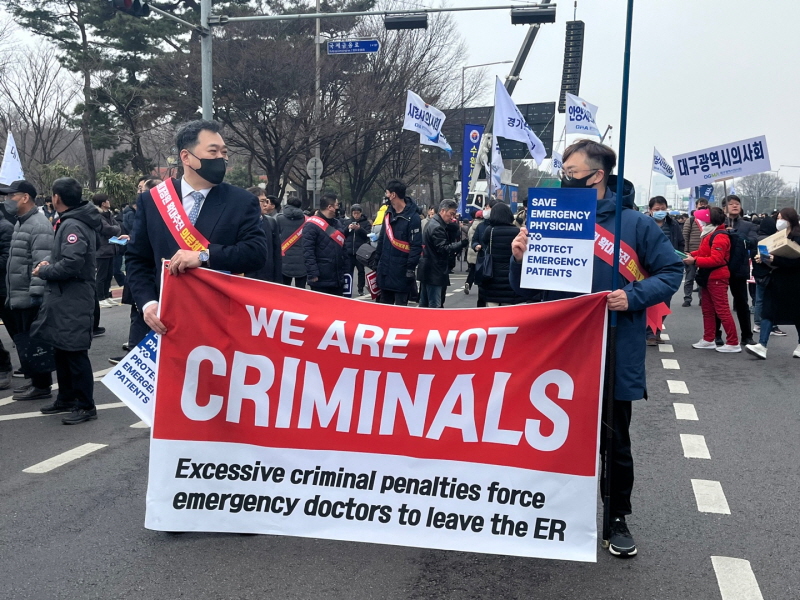 의사 총궐기대회 참가자들이 '우린 범죄자가 아니다'라는 문구가 적힌 플래카드를 들고 있다.