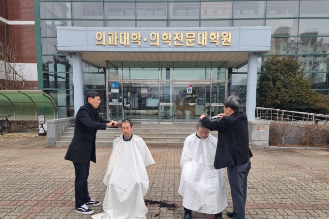 류세민 강원대 의대 학장(흉부외과)과 유윤종 의학과장(이비인후과) 등 교수진들은 이날 오전 강원대 의대 앞에서 대학의 일방적 의대 정원 신청에 반대하는 삭발식을 가졌다.