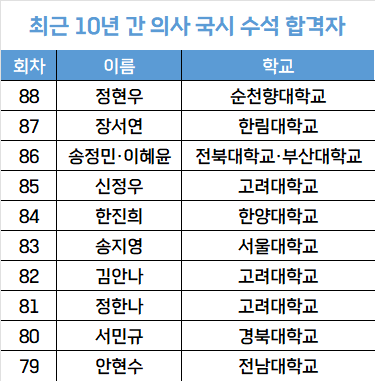 한편, 최근 10년 간 의사 국시에서 수석을 배출한 학교로는 고려대 의대가 3명을 기록하며 가장 많았다.