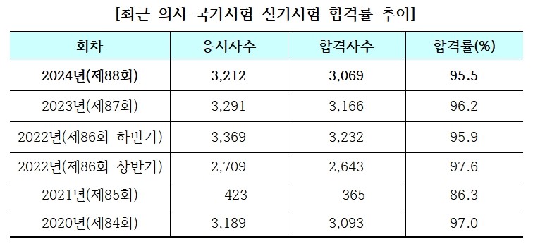국시원에 따르면, 제88회 의사 국가시험 실기시험은 전체 3212명의 응시자 중 3069명이 합격해 95.5%의 합격률을 보였다.