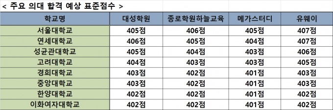 한양대와 이화여대 또한 최소 401점(종로하늘)에서 최고 402점(대성, 유웨이, 메가스터디)으로 추계됐다.