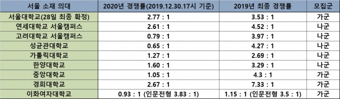 [데일리메디 박성은 기자] 대부분의 의과대학 2020년 정시 모집 마감을 하루 앞둔 12월30일 서울 소재 주요 의과대학 경쟁률 양상이 작년과 유사한 것으로 관측된다.