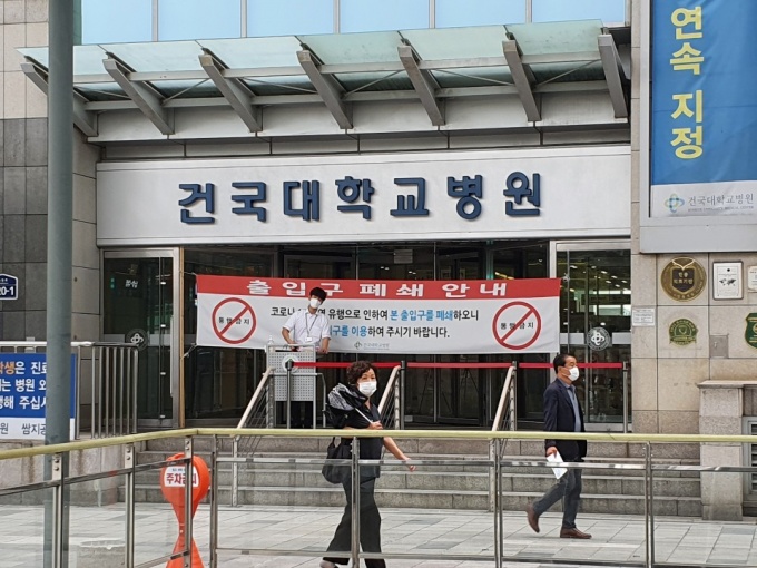 전공의 파업이 확대되는 가운데 병원들은 코로나19 방역에도 분주하다. 중대본에 따르면 이날 코로나19 신규 확진자는 324명으로, 수도권을 중심으로 확산세가 가파르다. 병원들은 출입구에 체온측정기와 손소독제를 비치하고 내원객들의 상태를 확인하고 있다. 이날 오전 건국대병원이 주출입구를 폐쇄한 모습이다.
