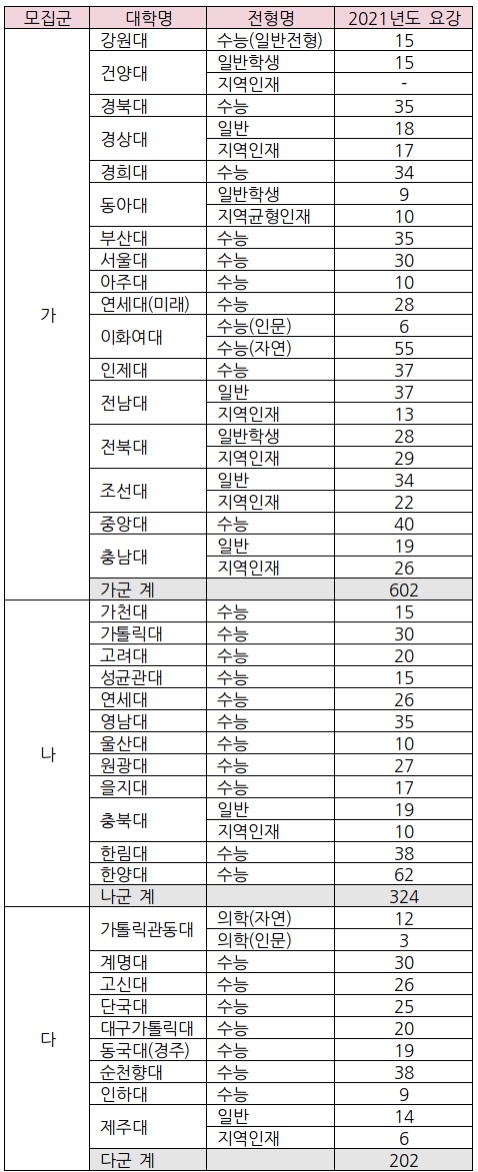 2021학년도 정시 모집 인원은 전체의 37.9%로 수능 이후 1128명을 새로이 모집한다. 가군 602명, 나군 324명, 다군 202명이다.