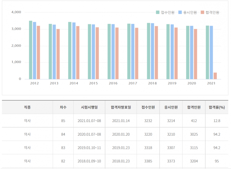 의사 국가시험 접수인원은 지난 2008년 4059명으로 최다를 기록 후 지속적으로 감소해 와 지난 2020년 3220명까지 떨어졌다. 해당 년도는 응시인원 또한 3210명으로 가장 적었다.
