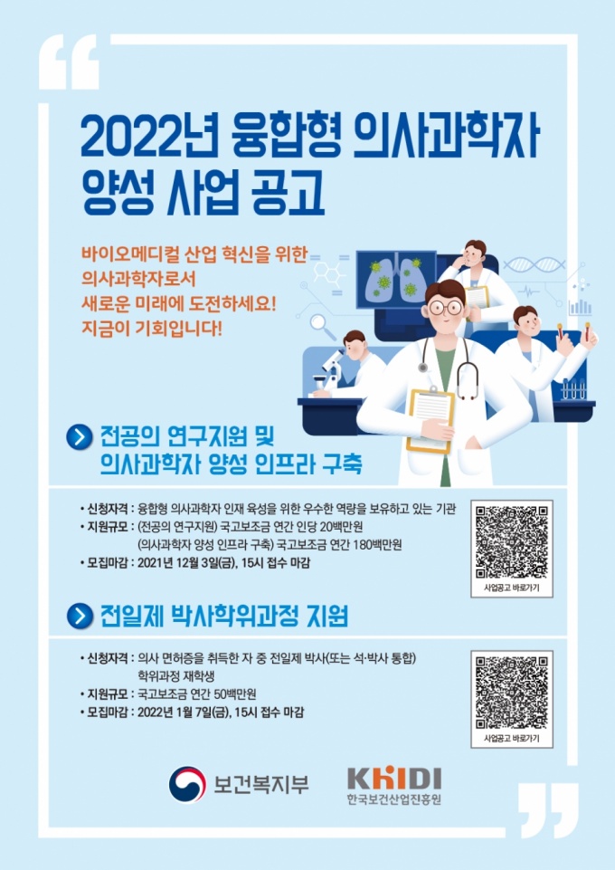 [데일리메디 임수민 기자] 보건복지부가 한국보건산업진흥원과 함께 '융합형 의사과학자 양성 사업'의 2022년도 신규 지원기관과 지원자를 모집한다.