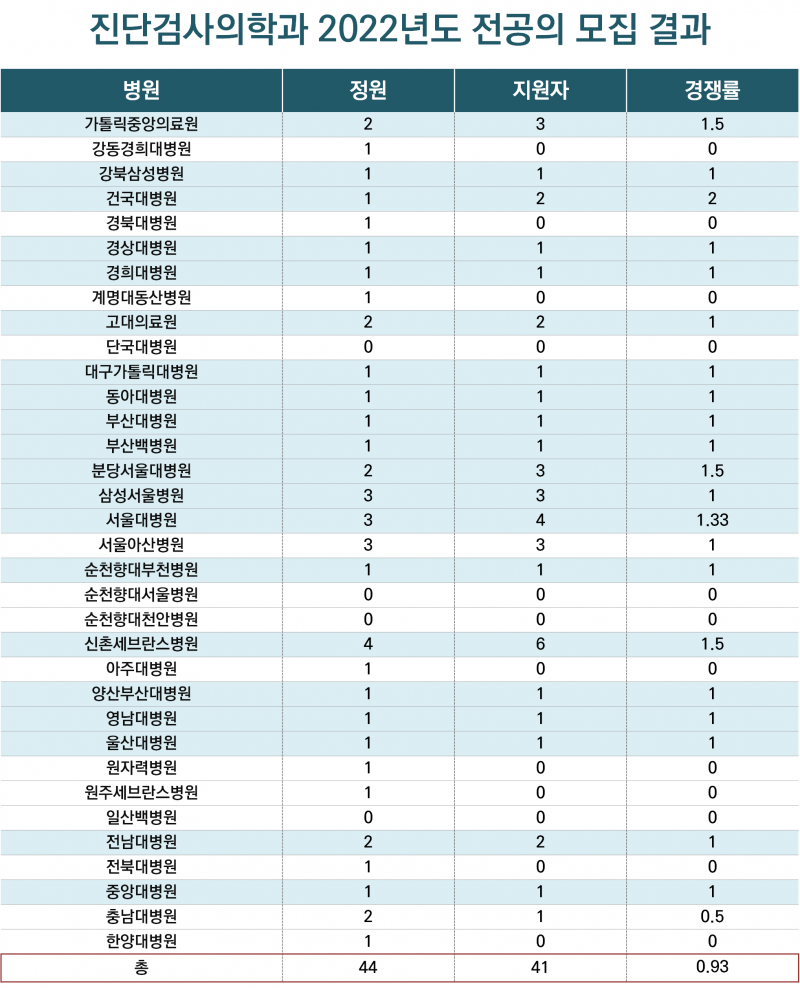 데일리메디가 전국 수련병원 86곳을 대상을 ‘2022년도 전공의(레지던트) 모집’ 결과를 분석한 결과, 진단검사의학과는 총정원 44명에 41명이 지원해 경쟁률 0.93대 1으로 마무리 지었다.