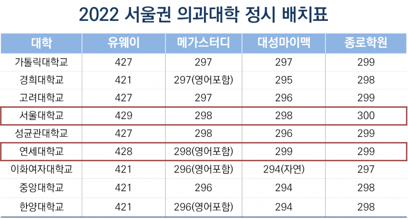 종로학원은 서울의대 합격선을 300점으로 보고, 연세의대와 고려의대, 가톨릭의대, 성균관의대는 299점으로 동일하게 예측했다. 경희의대·중앙의대·한양의대는 298점, 이화의대를 297점으로 분석했다.