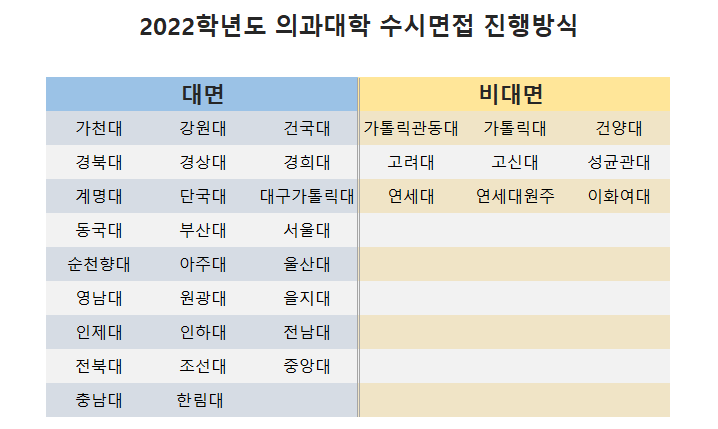 대면 면접을 진행한 학교는 가천대·강원대·건국대·경북대·경상대·경희대·계명대·단국대·대구가톨릭대·동국대·부산대·서울대·순천향대·아주대·울산대·영남대·원광대·을지대·인제대·인하대·전남대·전북대·조선대·중앙대·충남대·한림대 등이다.