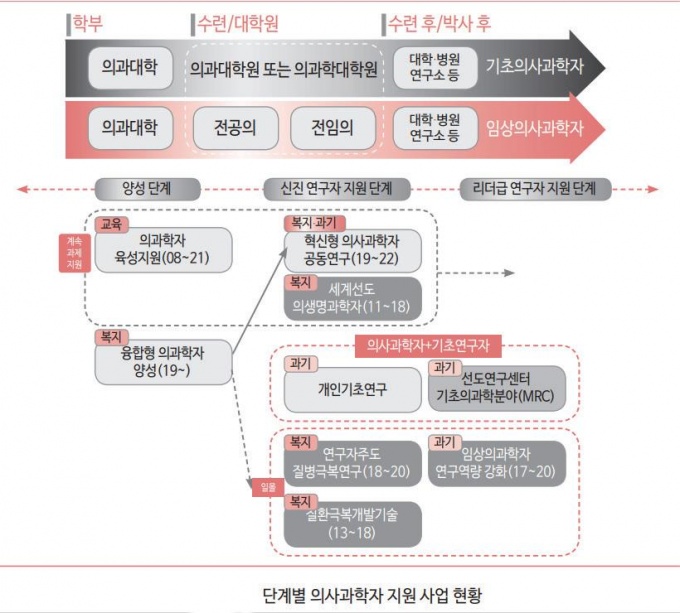 연구팀은 “의사과학자 양성 이후 연구비 확보 어려움으로 의사과학자로 안착하기가 어렵다는 것이 현장의 호소다. 인건비 유지를 위해 산발적으로 과제를 지원하다보니 연구의 단절이 발생한다”고 밝혔다.