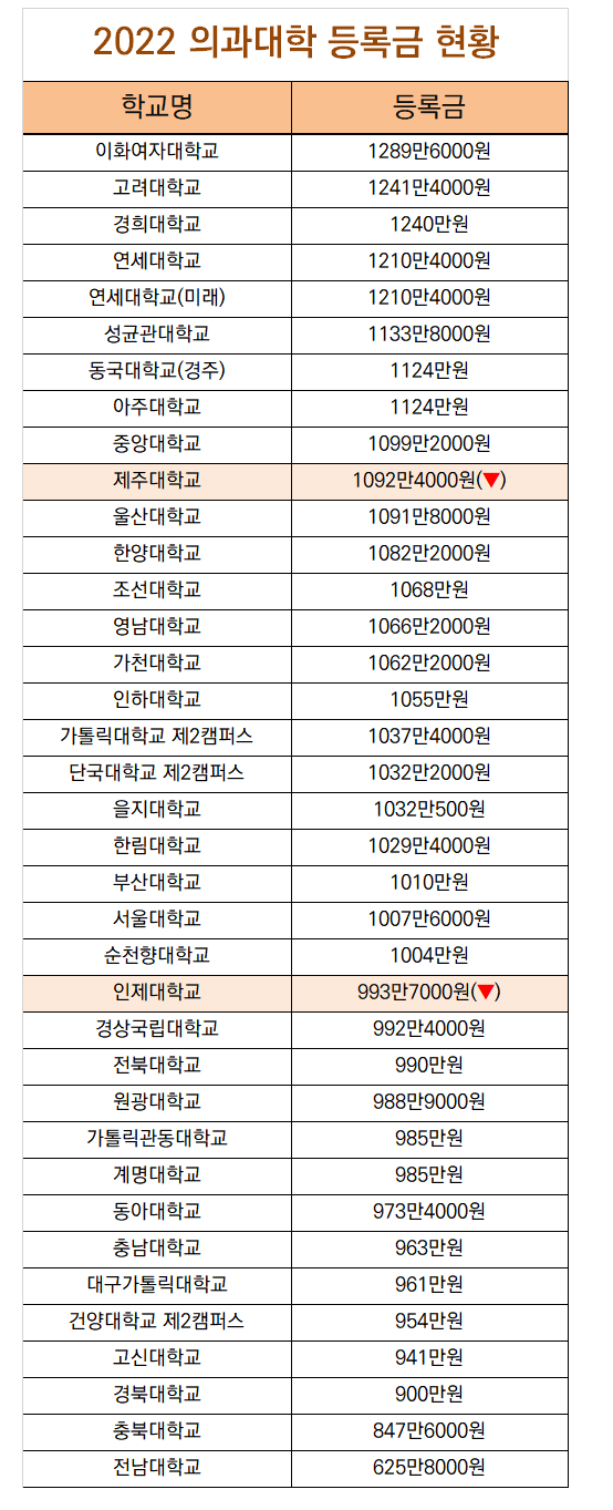 교육부와 한국대학교육협의회가 29일 발표한 4년제 일반대학과 교육대학 194개 학교 ‘2022년 4월 대학정보공시결과’를 분석한 결과, 2022년 의과대학 등록금은 평균 1039만284원으로 나타났다. 이화의대가 1289만원으로 가장 높았고 전남의대가 625만원으로 제일 낮아 두 배가 넘는 차이를 보였다.