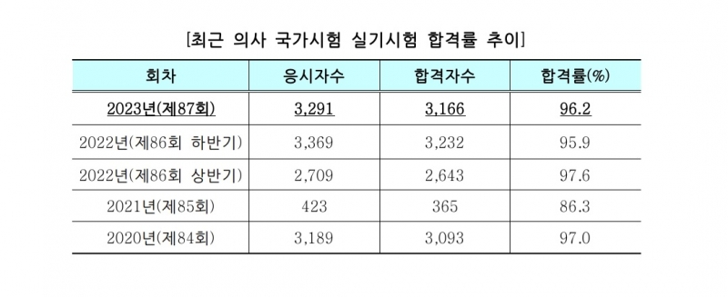 올해 의사 국가시험 실기 합격률이 96.2%를 기록했다.