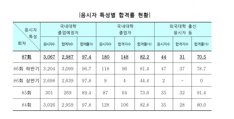 또한 기 졸업자 합격률은 82.2%였다. 외국의대 출신 응시자 합격률은 70.5%에 그쳤다.