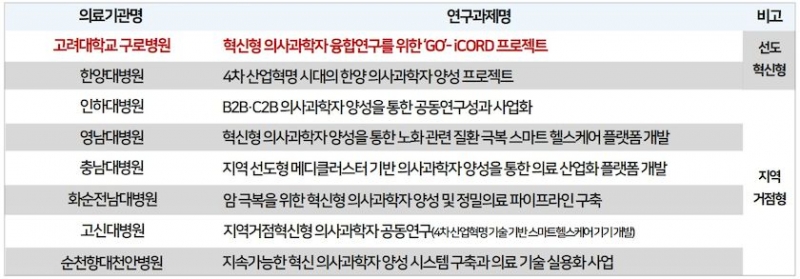 총 477억3600만원이 투입된 이 사업에는 고대구로병원, 한양대병원, 인하대병원, 영남대병원, 충남대병원, 화순전남대병원, 고신대병원, 순천향대천안병원 등 총 8개 병원이 참여했다.