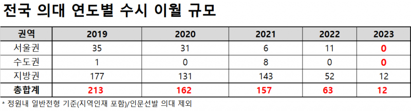 이는 ▲2019년 213명 ▲2020년 162명 ▲2021년 157명 ▲2022년 63명에 이어 또다시 큰 폭으로 떨어진 수치다. 특히 서울권과 수도권 지역 대학은 단 한 명의 이월 인원이 없었다.