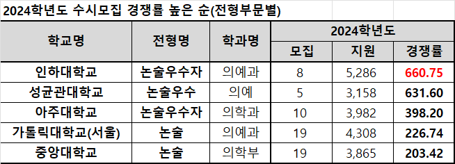 2024학년도 대입 수시모집에서 의과대학 경쟁률이 전년대비 또 상승했다. 인하대 의대 논술전형의 경우 무려 660대 1을 기록했다.