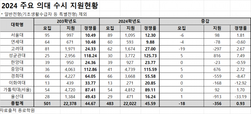 17일 입시 전문기업 종로학원에 따르면 주요 10개 의대에 '일반전형'으로 총 2만2022명이 지원해 45.59대 1의 평균 경쟁률을 나타냈다. 이는 지난해 44.67대 1보다 소폭 상승한 수치다.