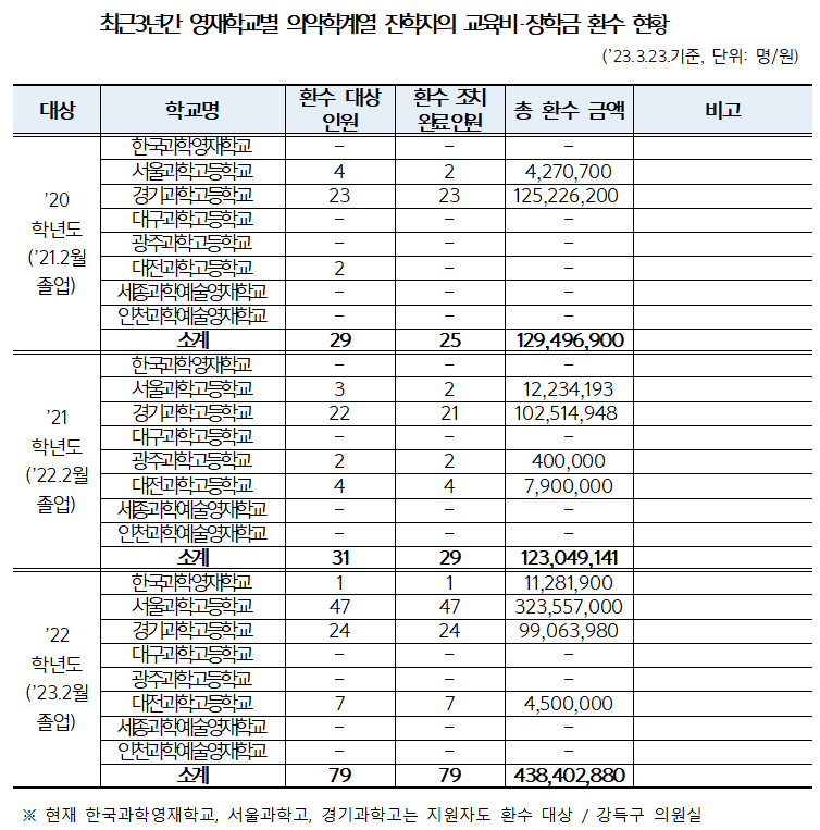 2022학년도 서울과학고에서 환수 조치가 된 학생은 47명으로 총 환수 금액은 3억2000만원을 넘겼다. 경기과학고의 경우 2022학년도 총 24명의 학생의 장학금을 환수했다.