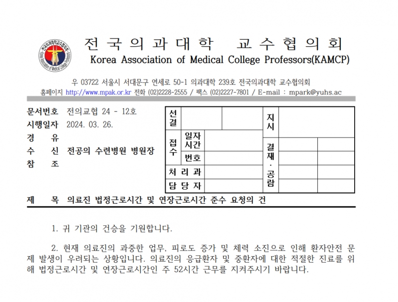 전국의과대학교수협의회(이하 전의교협)은 "전국 수련병원에 법정근로시간과 연장근로시간 준수 협조를 요청하는 공문을 보냈다"고 26일 밝혔다.