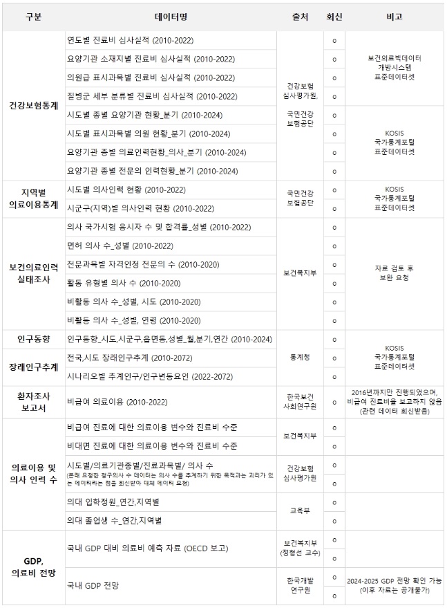 서울의대 비대위가 공개한 표준 데이터세트 목록