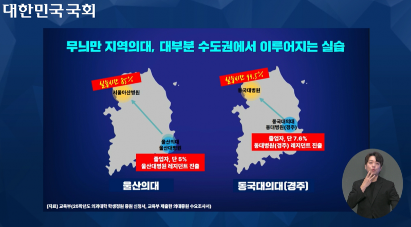 그가 소개한 2025학년도 의대 학생정원 증원 신청서·수요조사서 자료에 따르면 울산의대 졸업자의 단 5%가 울산대병원 전공의로 진출하고, 실습시간 85%를 서울아산병원에서 보낸다.
