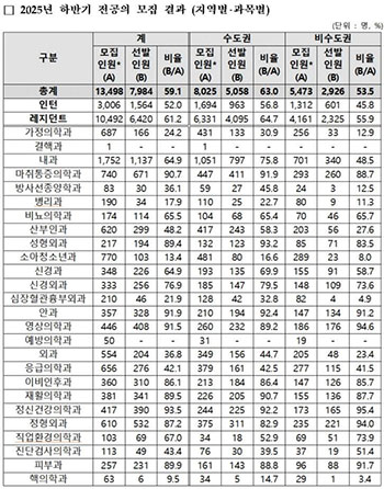 보건복지부가 발표한 2025년도 하반기 전공의 모집 결과에서 수도권 병원 충원율은 63%로 나타났다. 비수도권 병원(53.5%)보다 약 10%P 높았다.