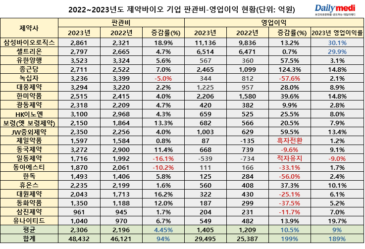 국내 제약사 중 가장 판관비가 많이 늘어난 곳은 삼성바이오로직스, 대원제약, 보령(옛 보령제약), 동국제약, 동화약품 순으로 나타났다.